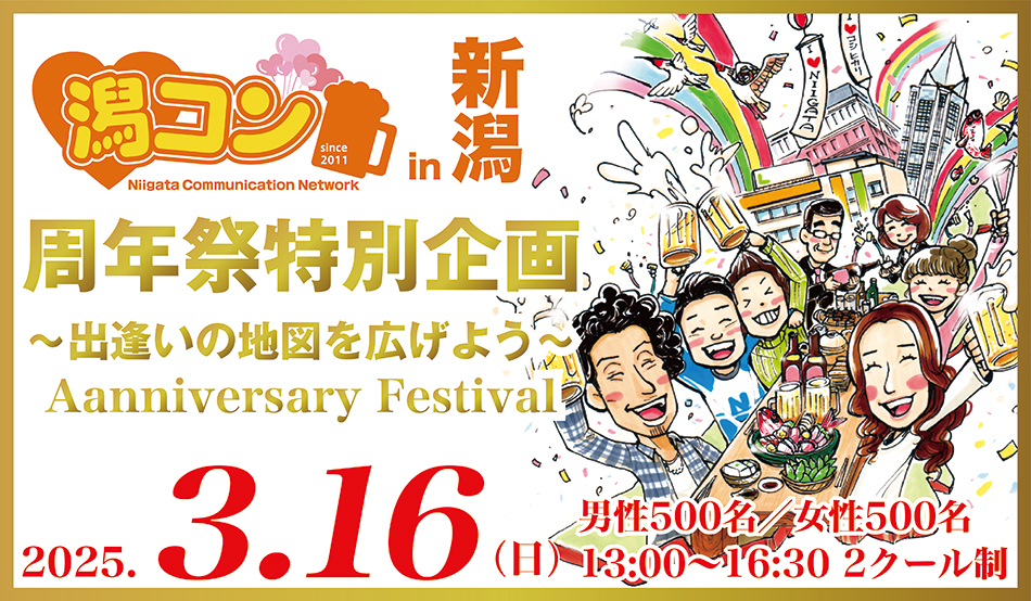 今回の周年祭企画は男女合計1,000名を大募集!男性500名・女性500名をMAX人数として開催します☆異性同性老若男女問わず、新たな出逢いがテーマですので男女比は必ずしも同じではありませんが、久しぶりの大規模開催潟コンをみんなでおもいっきり楽しみましょう! |